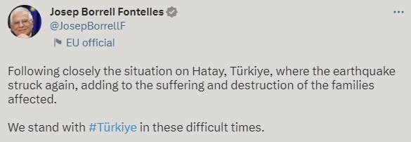 Avrupa Birliği (AB) Dış Bağlar ve Güvenlik Siyaseti Yüksek Temsilcisi Josep Borrell, Hatay merkezli zelzelelerle ilgili açıklamada bulundu.