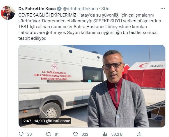 Kentte şebeke suyunun şu süreçte içme suyu olarak kullanıma uygun olmadığını belirten Bakan Koca şu sözleri kullandı: