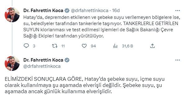 Hatay’da, zelzeleden etkilenen ve şebeke suyu verilemeyen bölgelerde ise su, belediyeler tarafından tankerlerle taşınıyor. Tankerlerle getirilen suyun klorlanması ve test edilmesi süreçleri de Sıhhat Bakanlığı Etraf Sıhhati Takımları tarafından yürütülüyor.