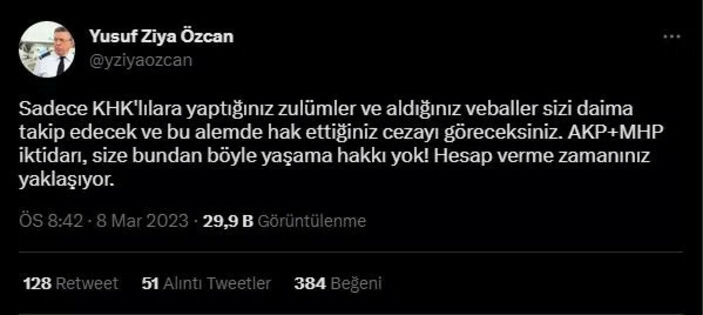 Özcan, Twitter hesabından yaptığı paylaşımda KHK’lılar üzerinden AK Parti ve MHP’yi gaye aldı.