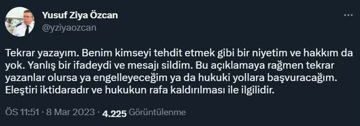 Yoğun reaksiyon üzerine paylaşımını silen Özcan, tekrar toplumsal medya hesabından bir açıklama yaptı.
