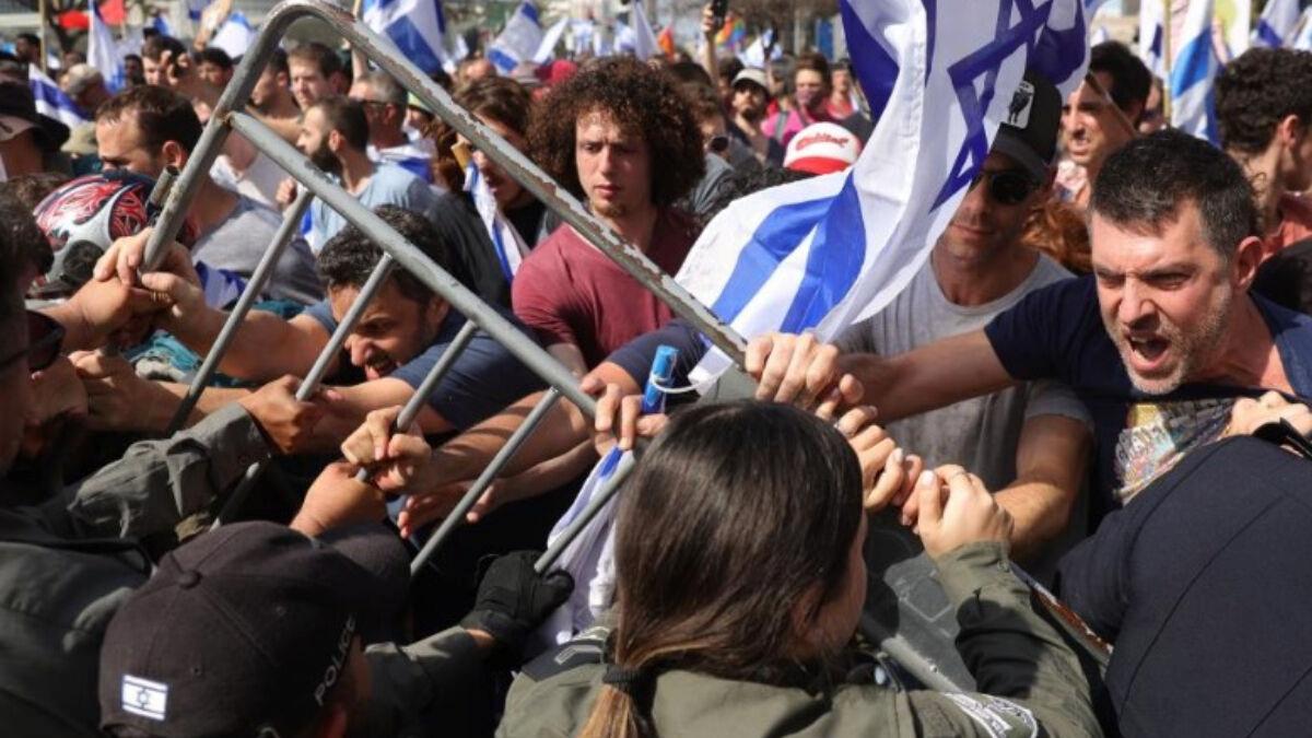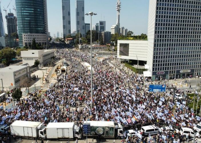 Başkent Tel Aviv’de bir ortaya gelen yüzlerce kişi, ellerindeki İsrail bayrakları ile Netanyahu hükümetinin “yargıyı zayıflatma” teşebbüslerine reaksiyon gösterdi.