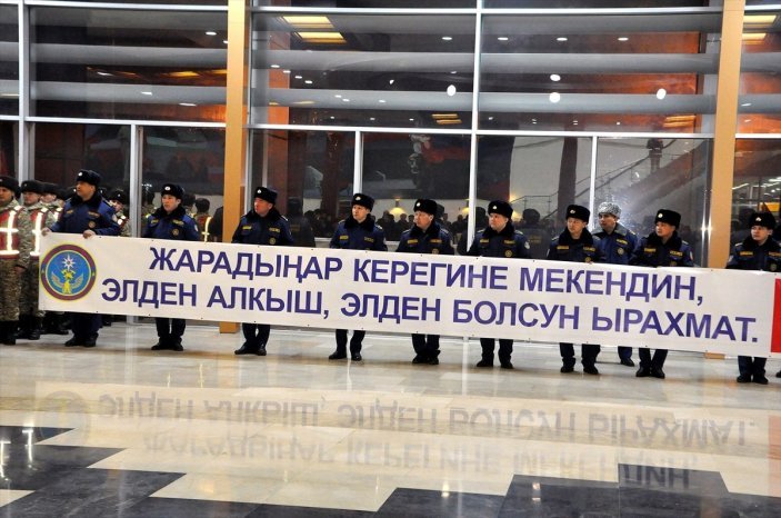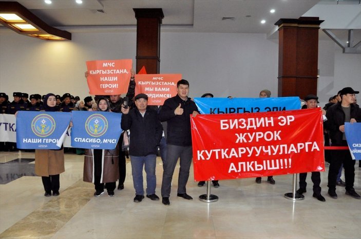 Kırgız arama kurtarma grubu için Manas Havalimanı’nda düzenlenen karşılama merasimine, Türkiye’nin Bişkek Büyükelçisi Ahmet Sadık Doğan, Kırgızistan Acil Durumlar Bakanı Boobek Ajikeyev, Kırgızistan-Türkiye Manas Üniversitesi Rektörü Prof. Dr. Alpaslan Ceylan ve öğrencileri, sivil toplum örgütleri temsilcileri, Kırgız ve Türkler katıldı.