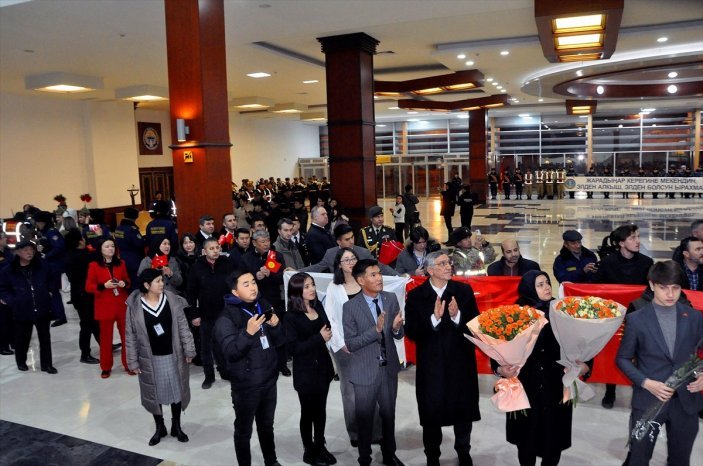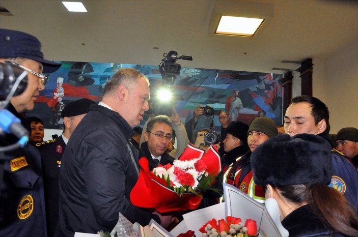Törende, Kırgız ve Türk bayrakları ile arama kurtarma takımının meslektaşları tarafından “Memleketinize güzel geldiniz”, “Vatanın çocuklarına alkış” yazılı afişler açıldı.