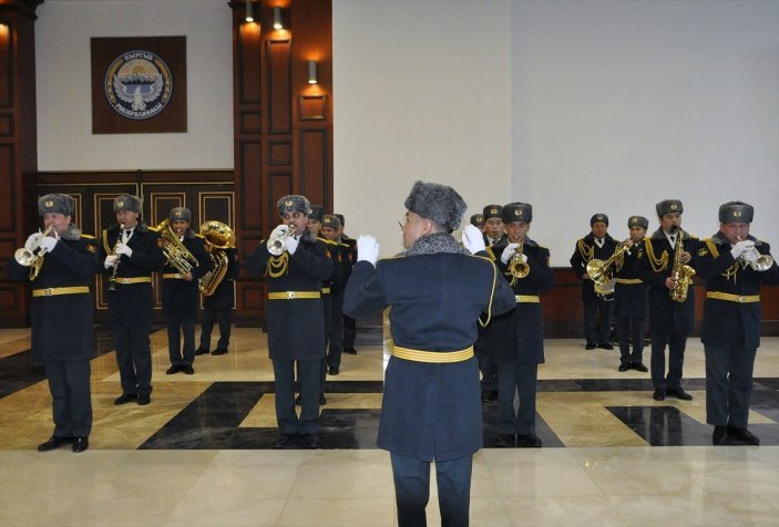 Bakanlığın orkestrası eşliğinde karşılanan takıma çiçekler takdim edildi ve Kırgız ulusal marşı okundu.